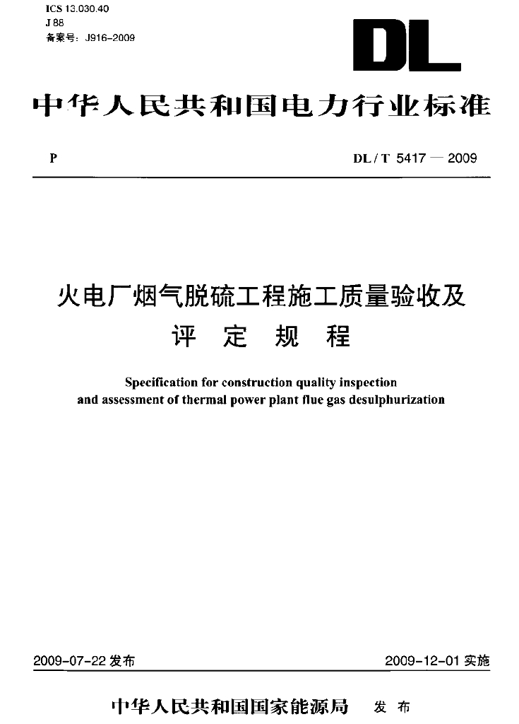 DL/T 5417-2009 火电厂烟气脱硫工程施工质量验收及评定规程