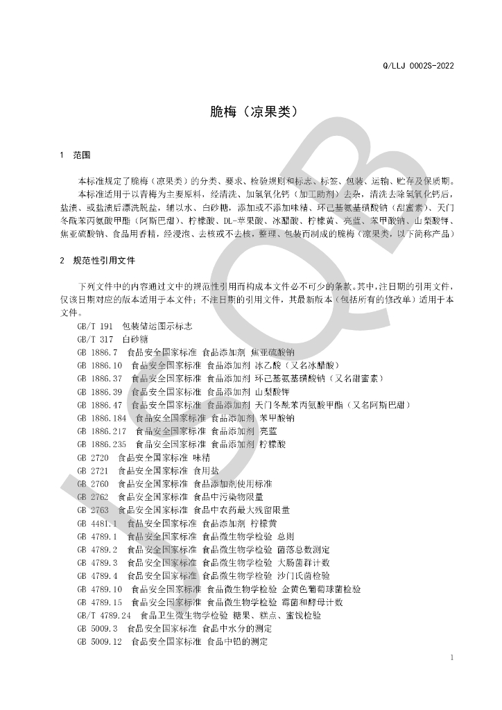 Q/LLJ 0002S-2022 脆梅(凉果类)