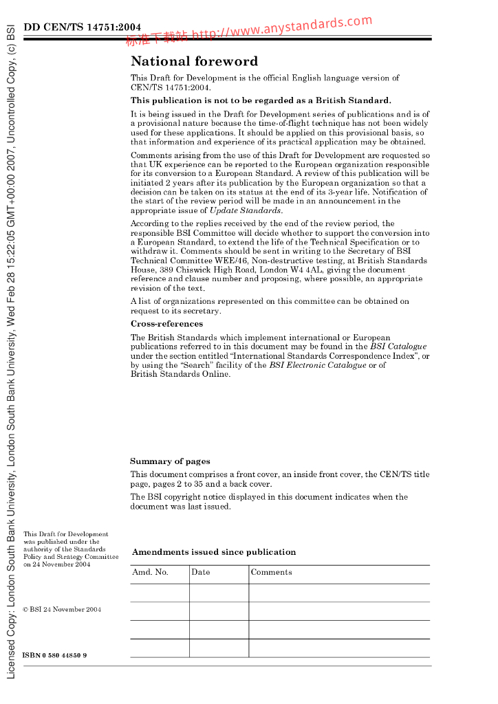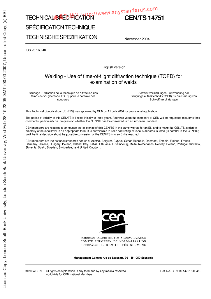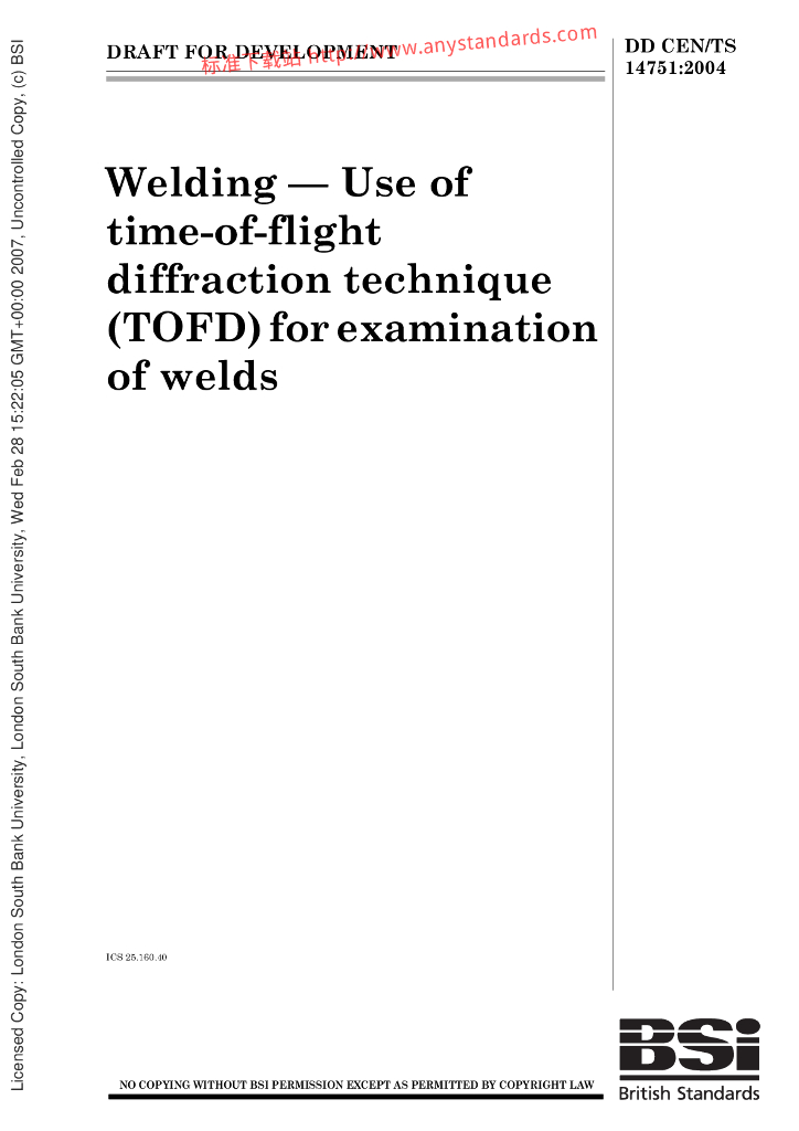 BS DD CEN TS 14751-2004 焊接.焊接检验用飞行时间衍射技术(TOFD)的使用