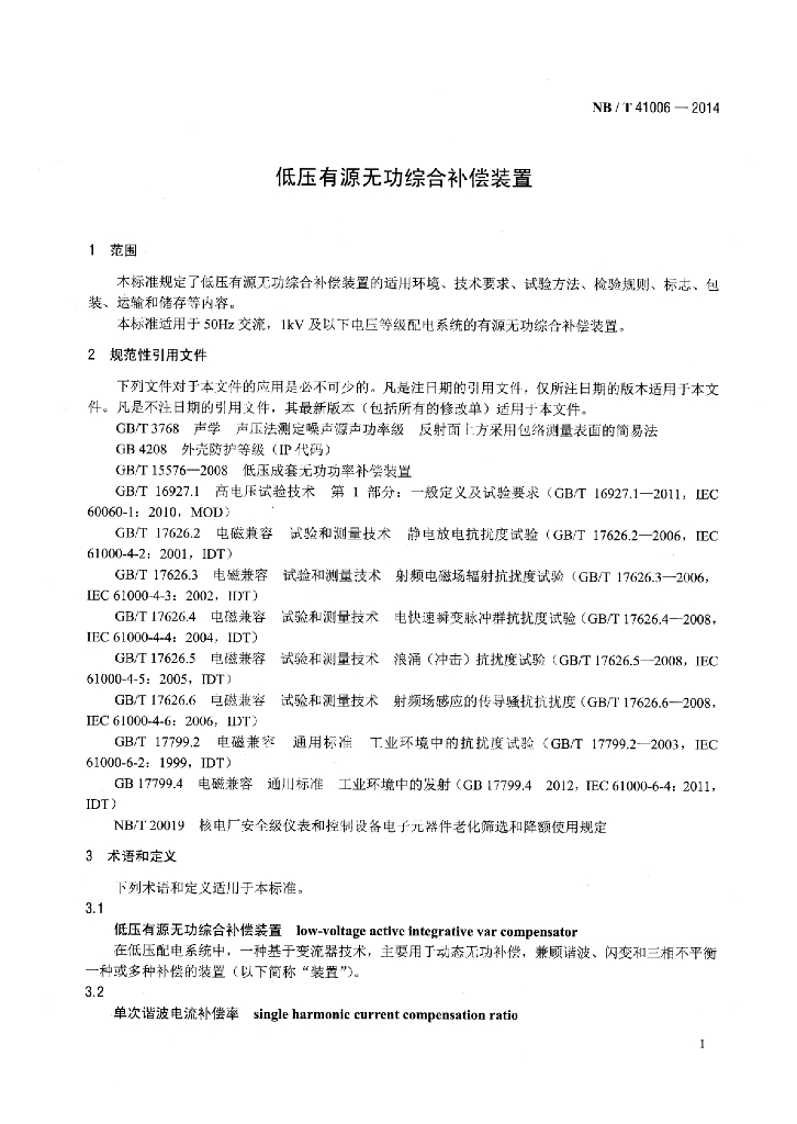 NB/T 41006-2014 低压有源无功综合补偿装置
