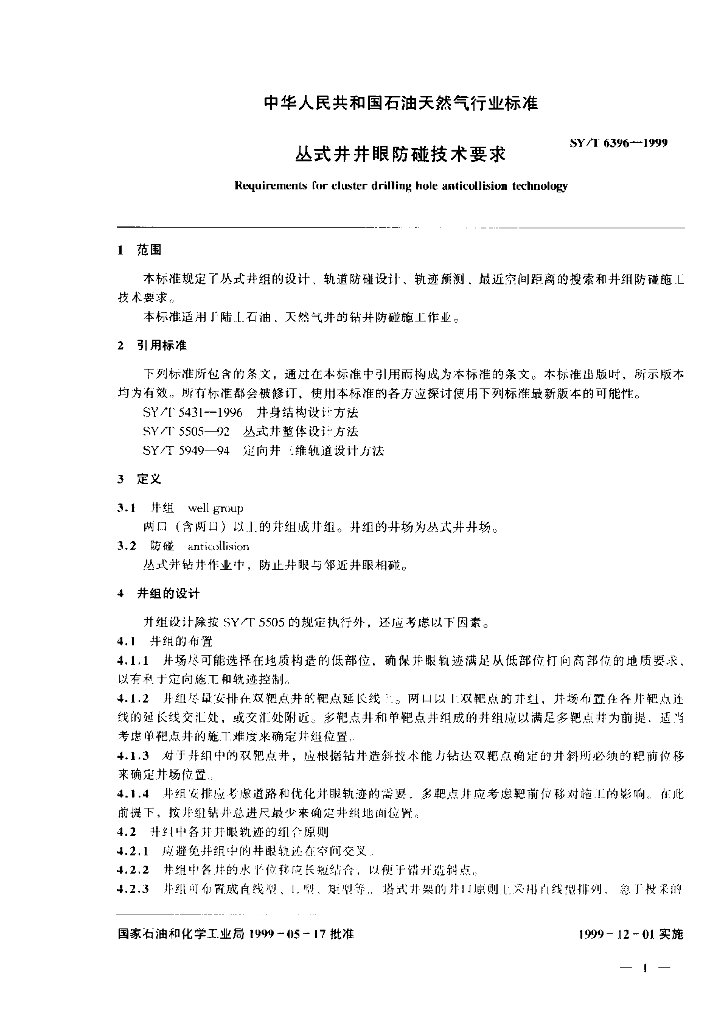SY/T 6396-1999 丛式井井眼防碰技术要求