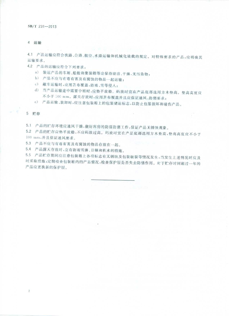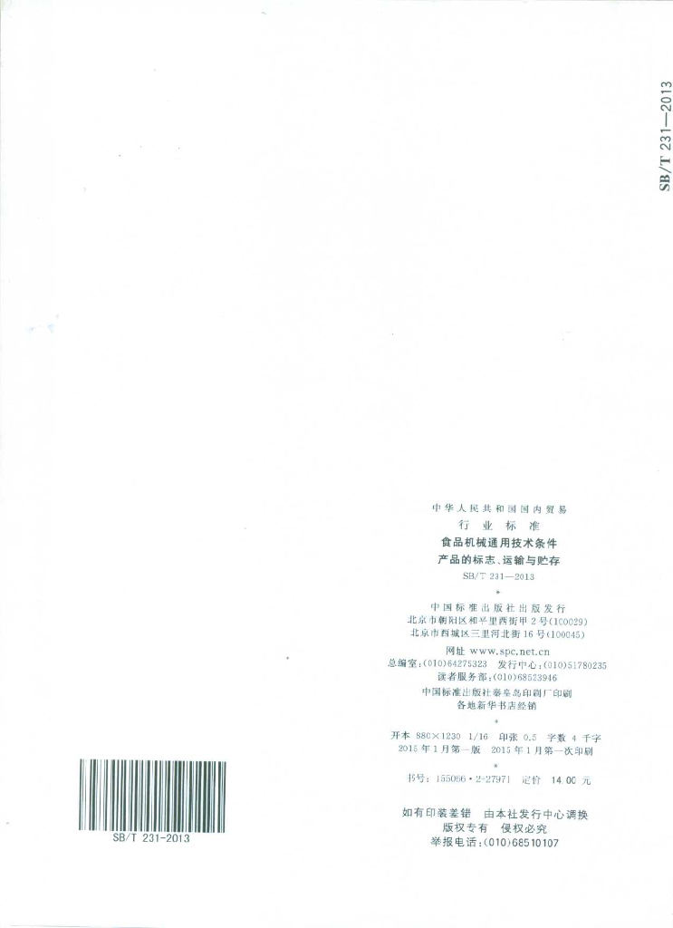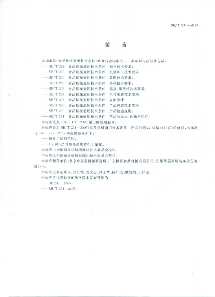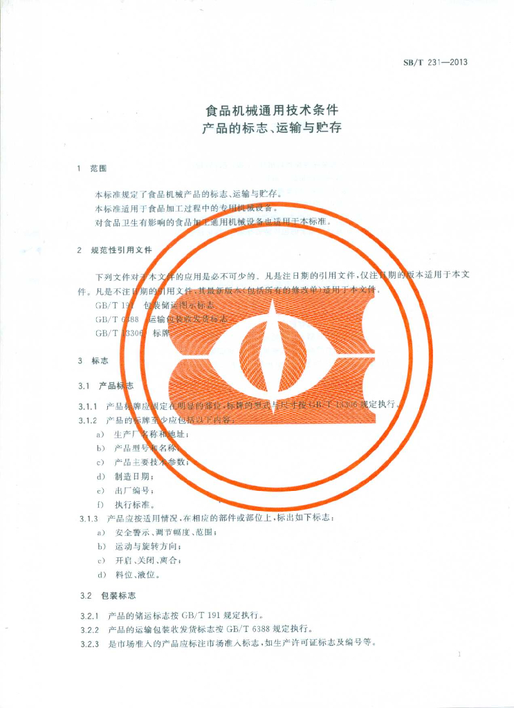 SB/T 231-2013 食品机械通用技术条件 产品的标志、运输与储存