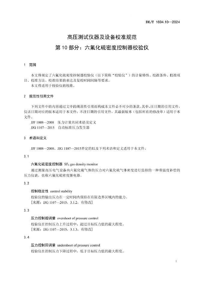 DL/T 1694.10-2024 高压测试仪器及设备校准规范 第10部分:六氟化硫密度控制器校验仪