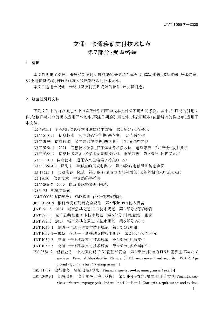JT/T 1059.7-2025 交通一卡通移动支付技术规范 第7部分:受理终端