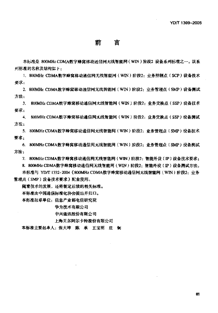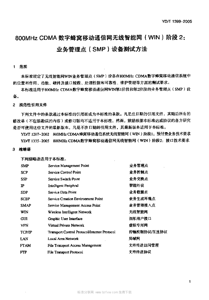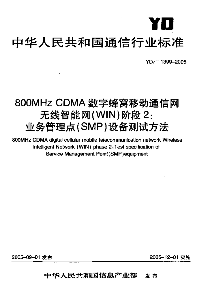 YD/T 1399-2005 800MHz CDMA 数字蜂窝移动通信网无线智能网(WIN)阶段2:业务管理点(SMP)设备测试方法