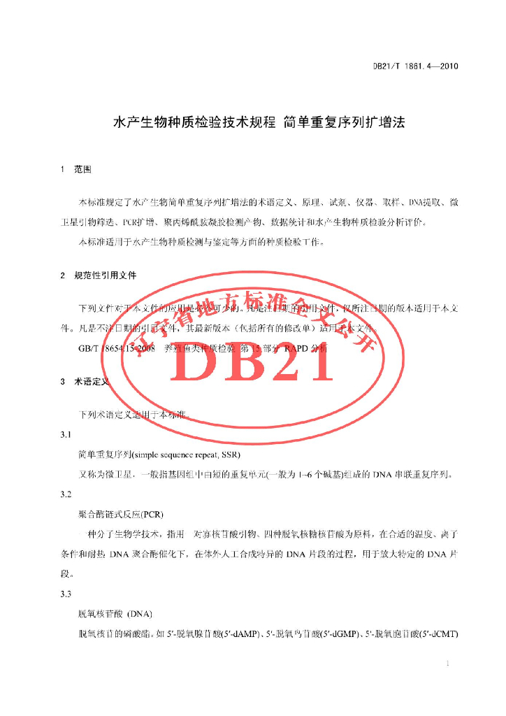 DB21/T 1861.4-2010 水产生物种质检验技术规程 简单重复序列扩增法