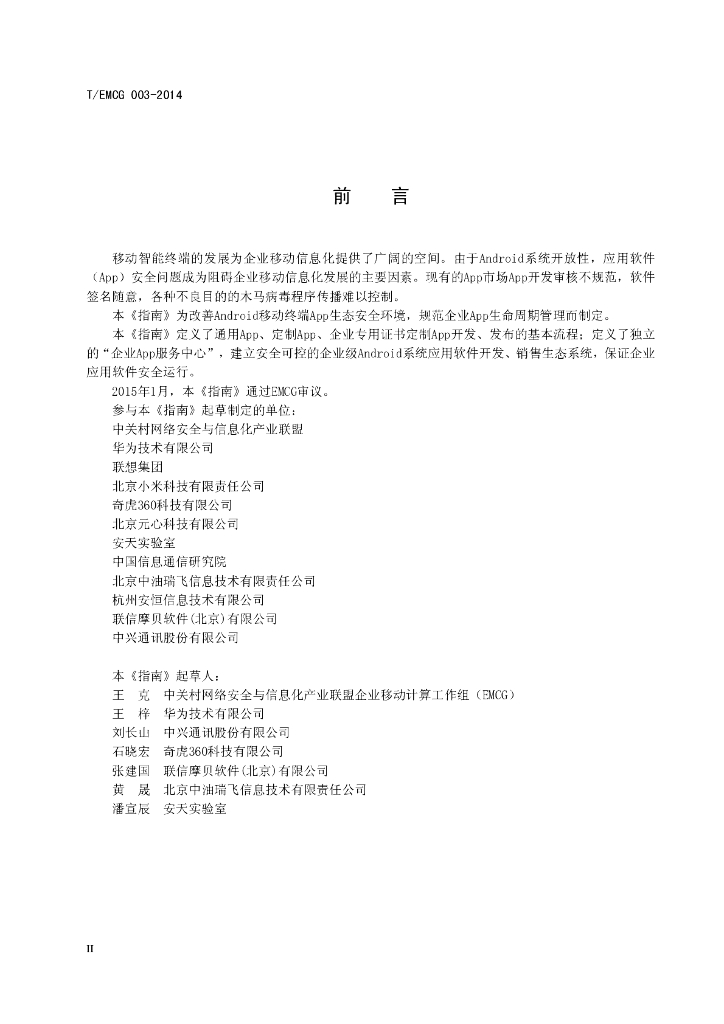 中关村网络安全与信息化产业联盟、华为技术有限公司、联想集团、北京小米科技有限责任公司、奇虎360科技有限公司、北京元心科技有限公司、安天实验室、中国信息通信研究院、北京中油瑞飞信息技术有限责任公司、杭州安恒信息技术有限公司、联信摩贝软件(北京)有限公司、中兴通讯股份有限公司