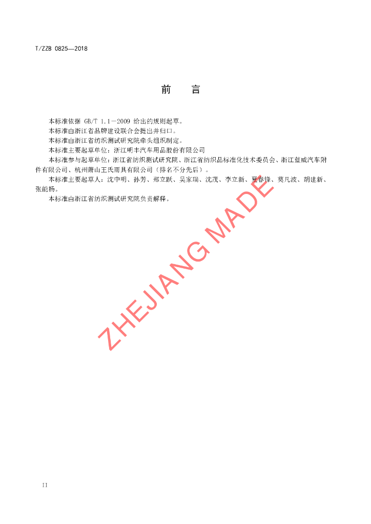 浙江明丰汽车用品股份有限公司、浙江省纺织测试研究院、浙江省纺织品标准化技术委员会、浙江蓝威汽车附件有限公司、杭州萧山王氏雨具有限公司