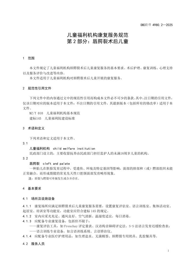 DB37/T 4980.2-2025 儿童福利机构康复服务规范 第2部分:唇腭裂术后儿童