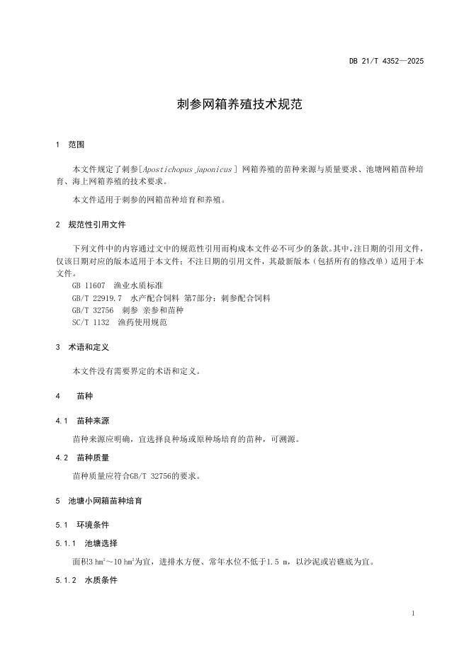 DB21/T 4352-2025 刺参网箱养殖技术规范