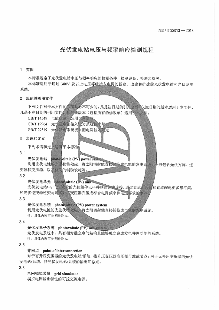 NB/T 32013-2013 光伏发电站电压与频率响应检测规程