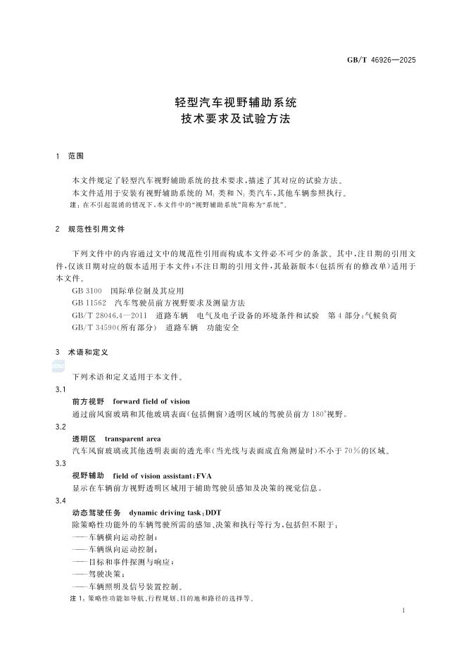 GB/T 46926-2025 轻型汽车视野辅助系统技术要求及试验方法
