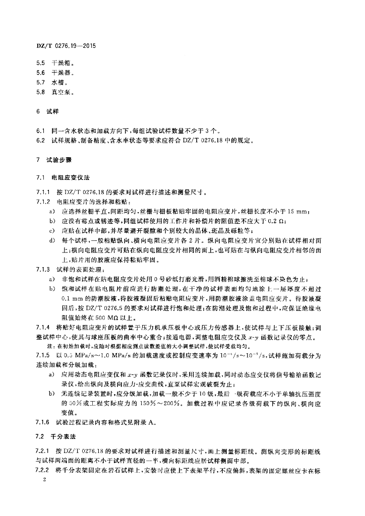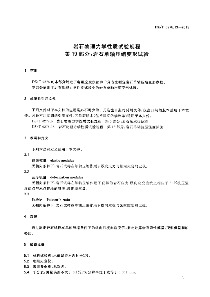 DZ/T 0276.19-2015 岩石物理力学性质试验规程 第19部分:岩石单轴压缩变形试验