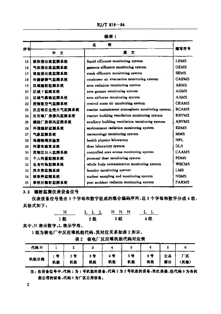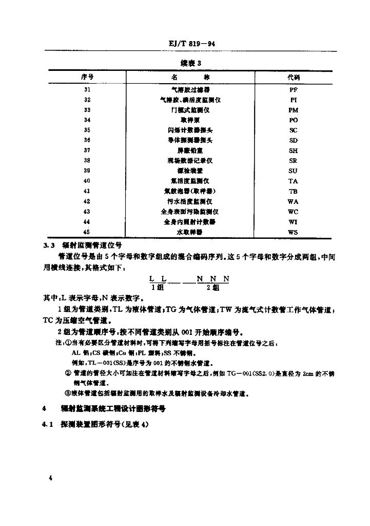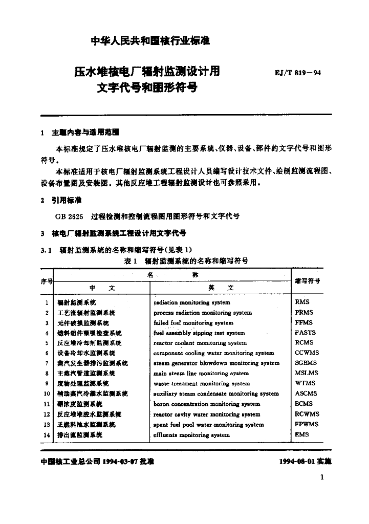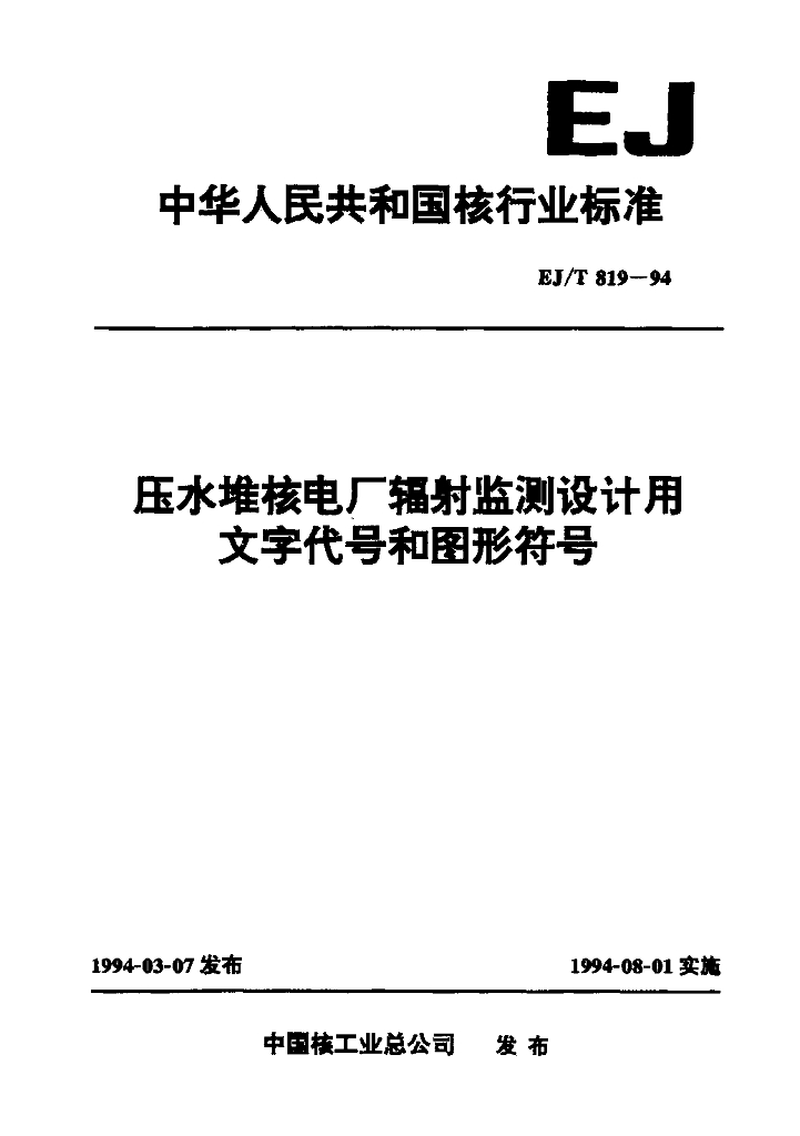 EJ/T 819-1994 压水堆核电厂辐射监测设计用文字代号和图形符号