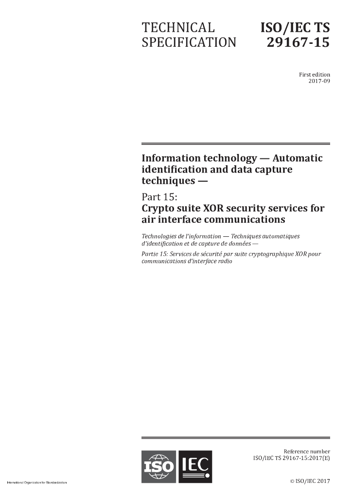 ISO/IEC TS 29167-15-2017 信息技术 自动识别和数据捕捉技术 第15部分 用于空中接口通信的加密套件XOR安全服务