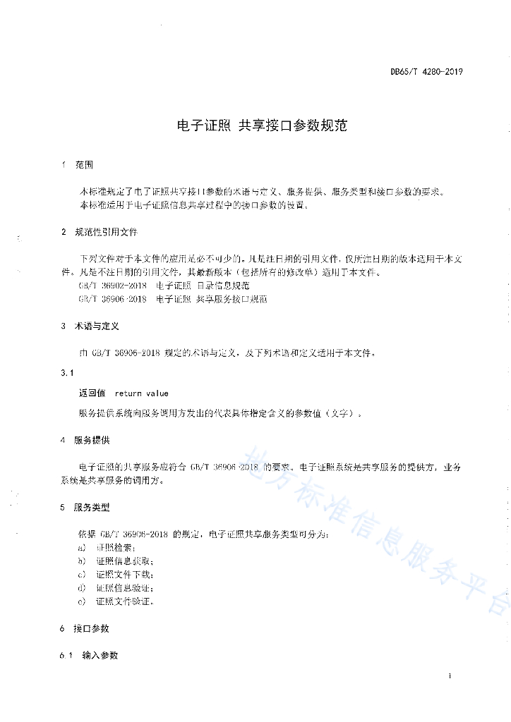 DB65/T 4280-2019 电子证照 共享接口参数规范