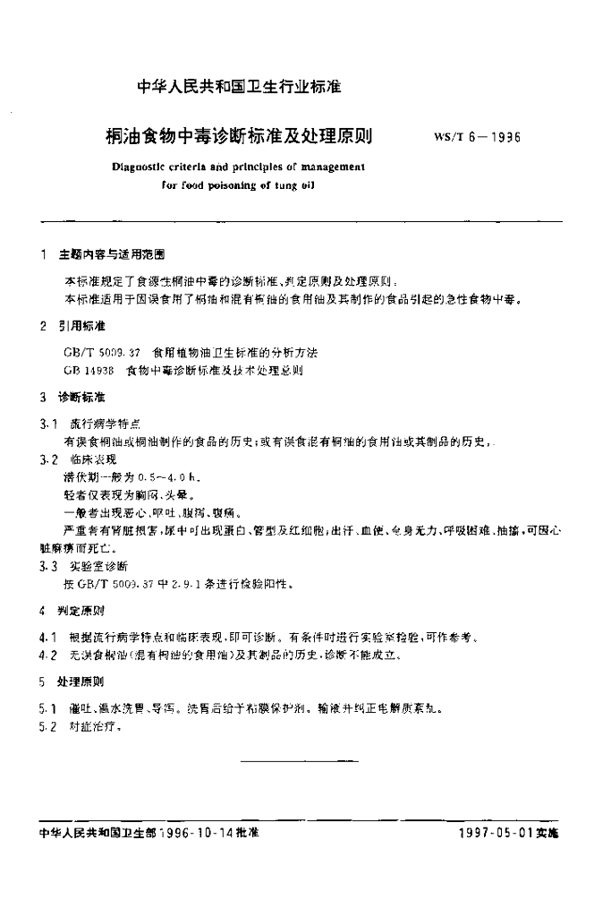 WS/T 6-1996 桐油食物中毒诊断标准及处理原则