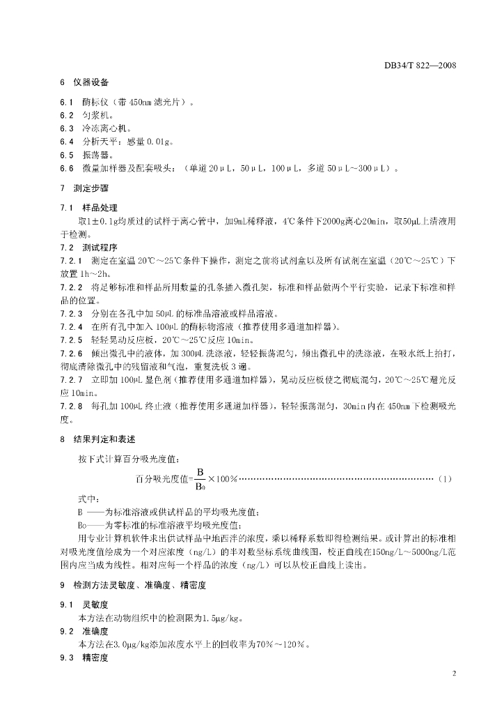 DB34/T 822-2008 动物组织中地西泮的残留测定酶联免疫吸附法