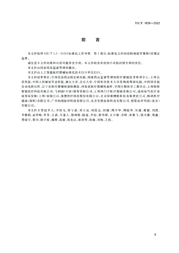 中国食品药品检定研究院、国家药品监督管理局医疗器械技术审评中心、上海长征医院、中国人民解放军总医院、浙江大学、北京大学、中国科学技术大学苏州高等研究院、中国科学院自动化研究所、辽宁省医疗器械检验检测院、河南省医疗器械检验所、中国生物医学工程学会、上海联影智能医疗科技有限公司、飞利浦(中国)投资有限公司、上海西门子医疗器械有限公司、通用电气医疗系统贸易发展(上海)有限公司、推想医疗科技股份有限公司、北京深睿博联科技有限责任公司、腾讯医疗健康(深圳)有限公司、广州柏视医疗科技有限公司、北京安德医智科技有限公司