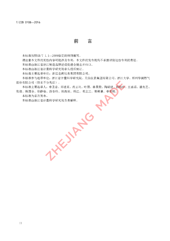 本标准由浙江省计量科学研究院牵头组织制订。、本标准主要起草单位:浙江苍南仪表集团有限公司。、本标准参与起草单位:浙江省计量科学研究院、天信仪表集团有限公司、浙江大学、郑州华润燃气股份有限公司(排名不分先后)。