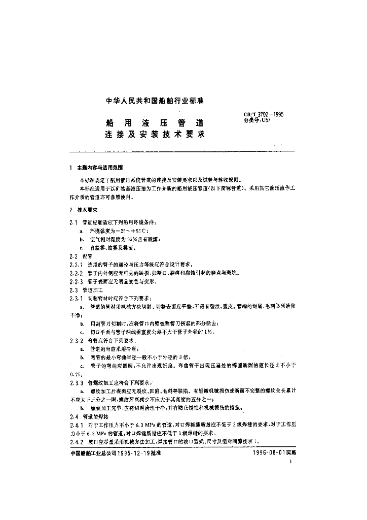 CB/T 3702-1995 船用液压管道连接及安装技术要求