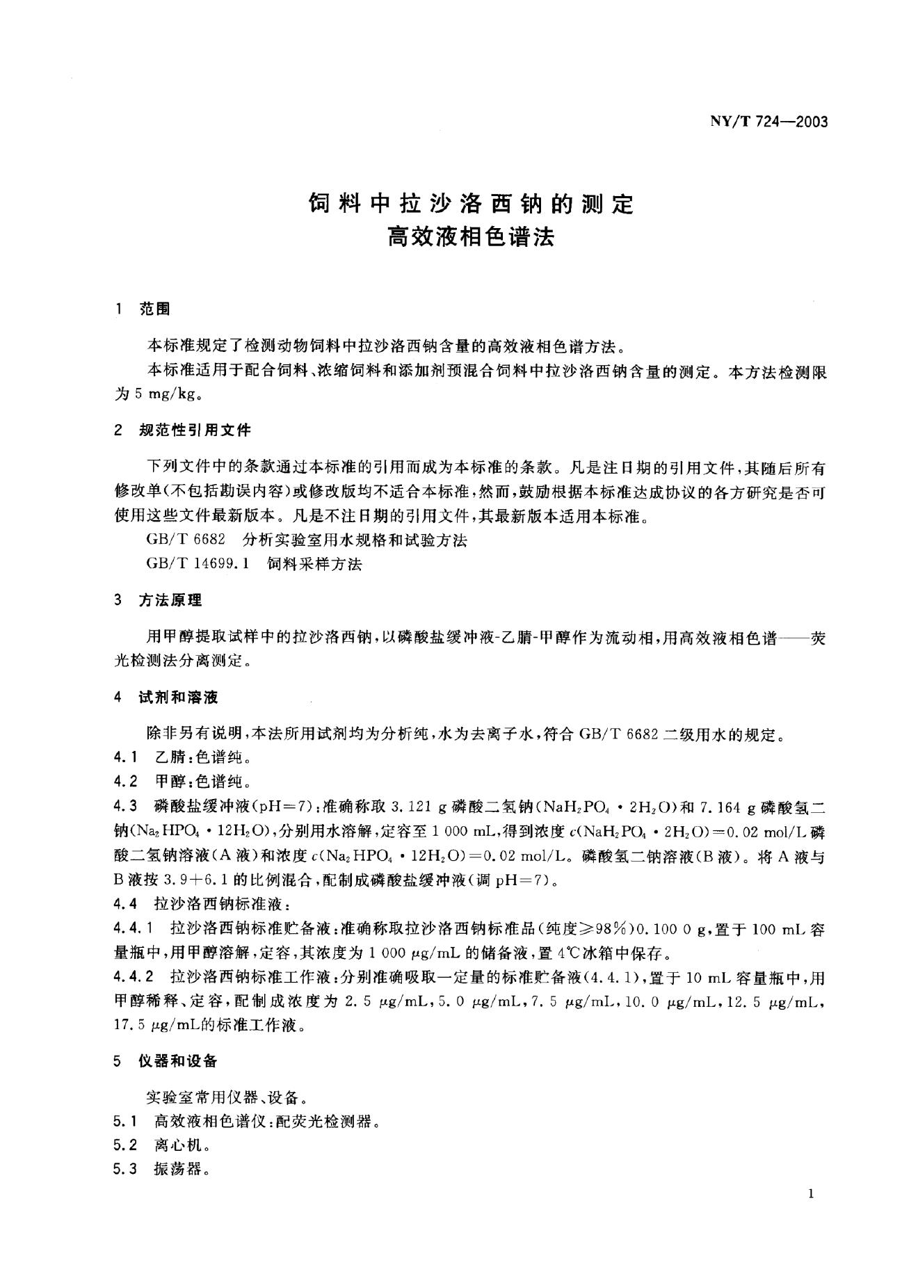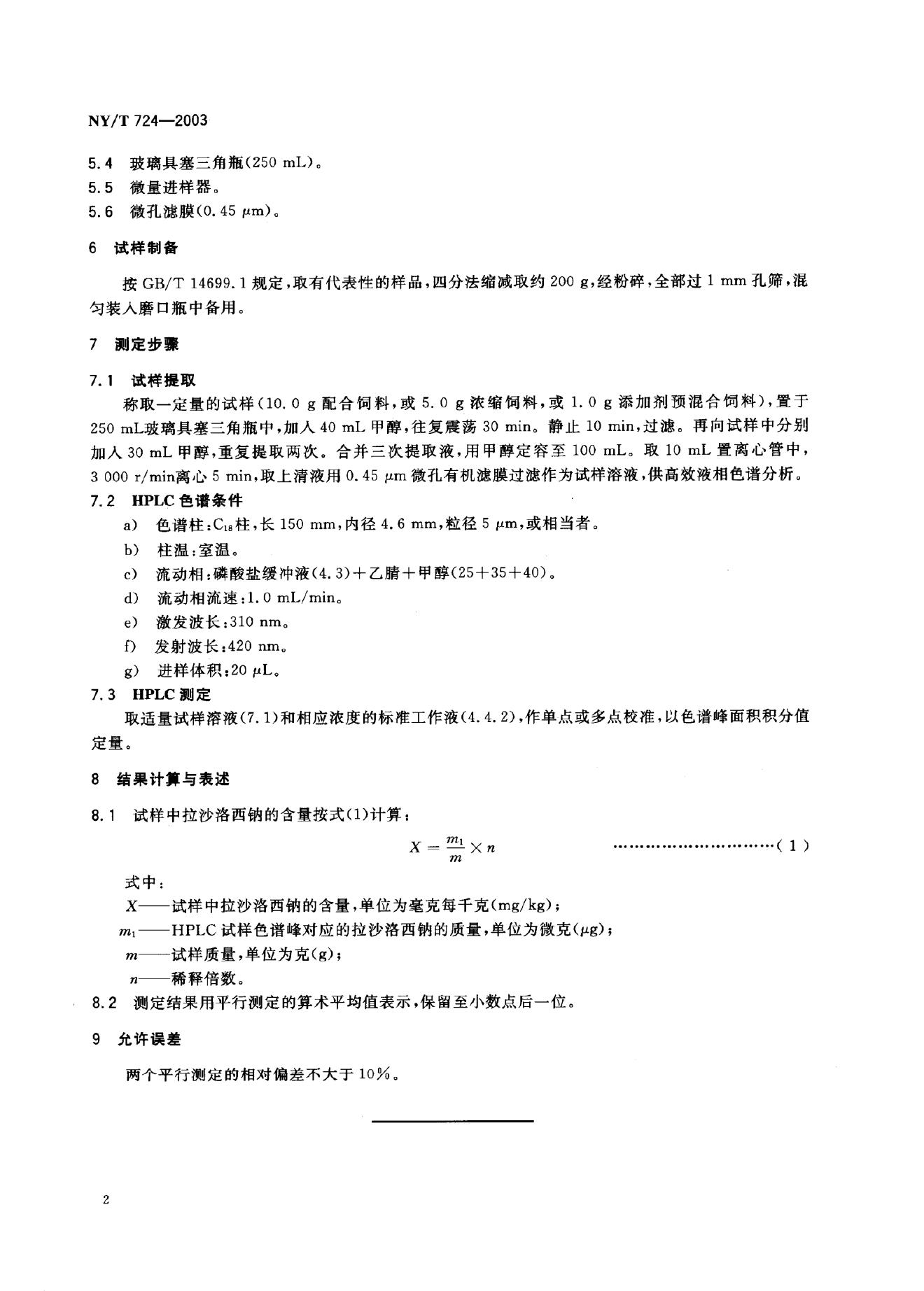 NY/T 724-2003 饲料中拉沙洛西纳的测定 高效液相色谱法