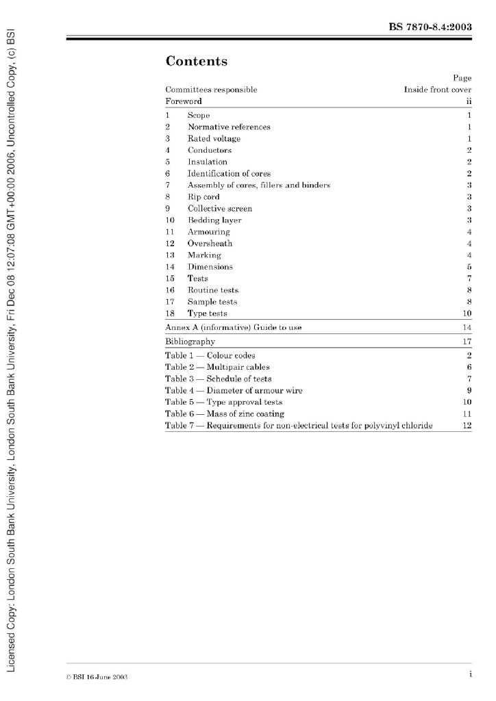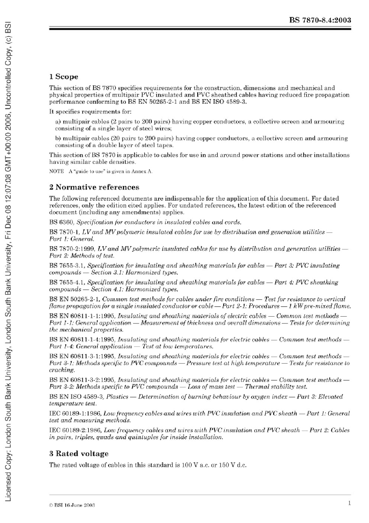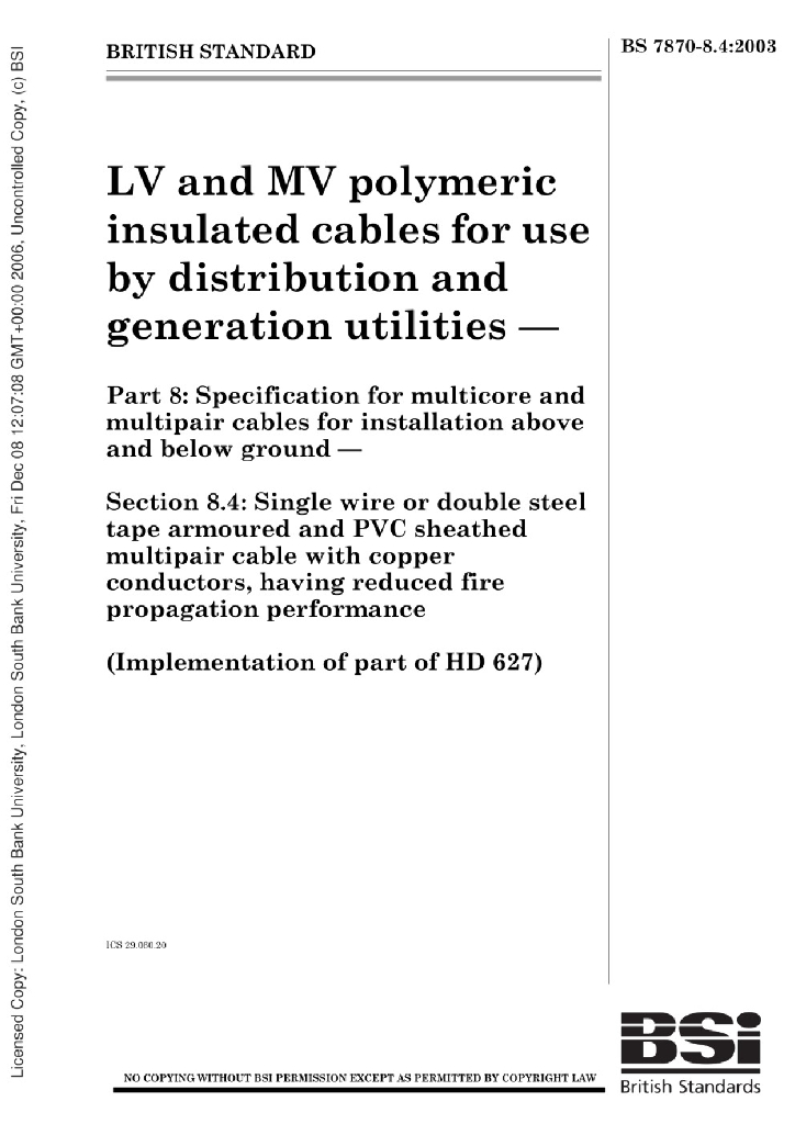 BS 7870-8.4:2003 用于配电和发电设备的低压和中压聚合物绝缘电缆 多核和多股电缆地上和地下安装规范 单线或双钢带铠装聚氯乙烯护套多股电缆铜导体,具有降低火焰传播性能 8.4节单线或双钢带铠装聚氯乙烯护套多股电缆铜导体,具有降低火焰传播性能
