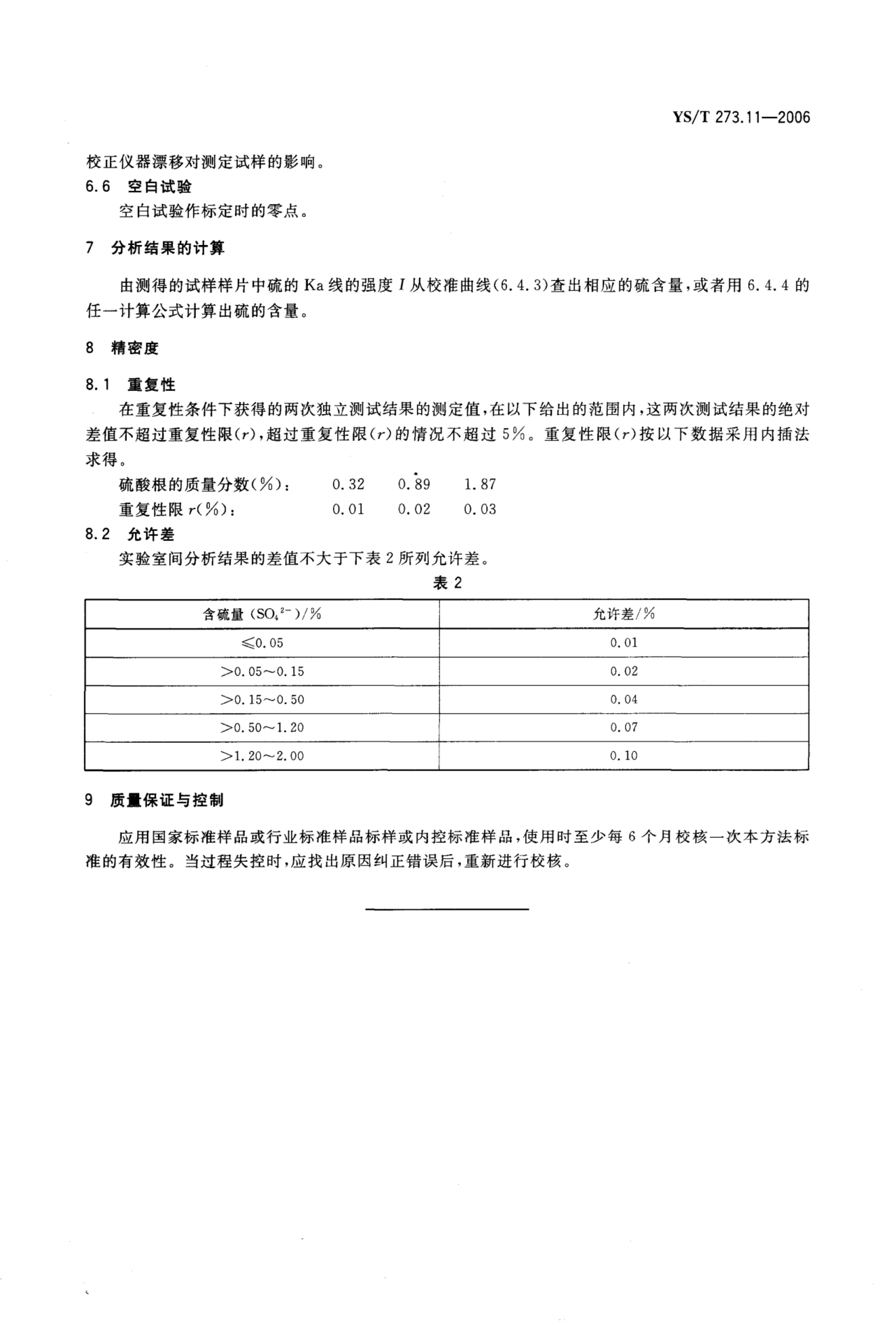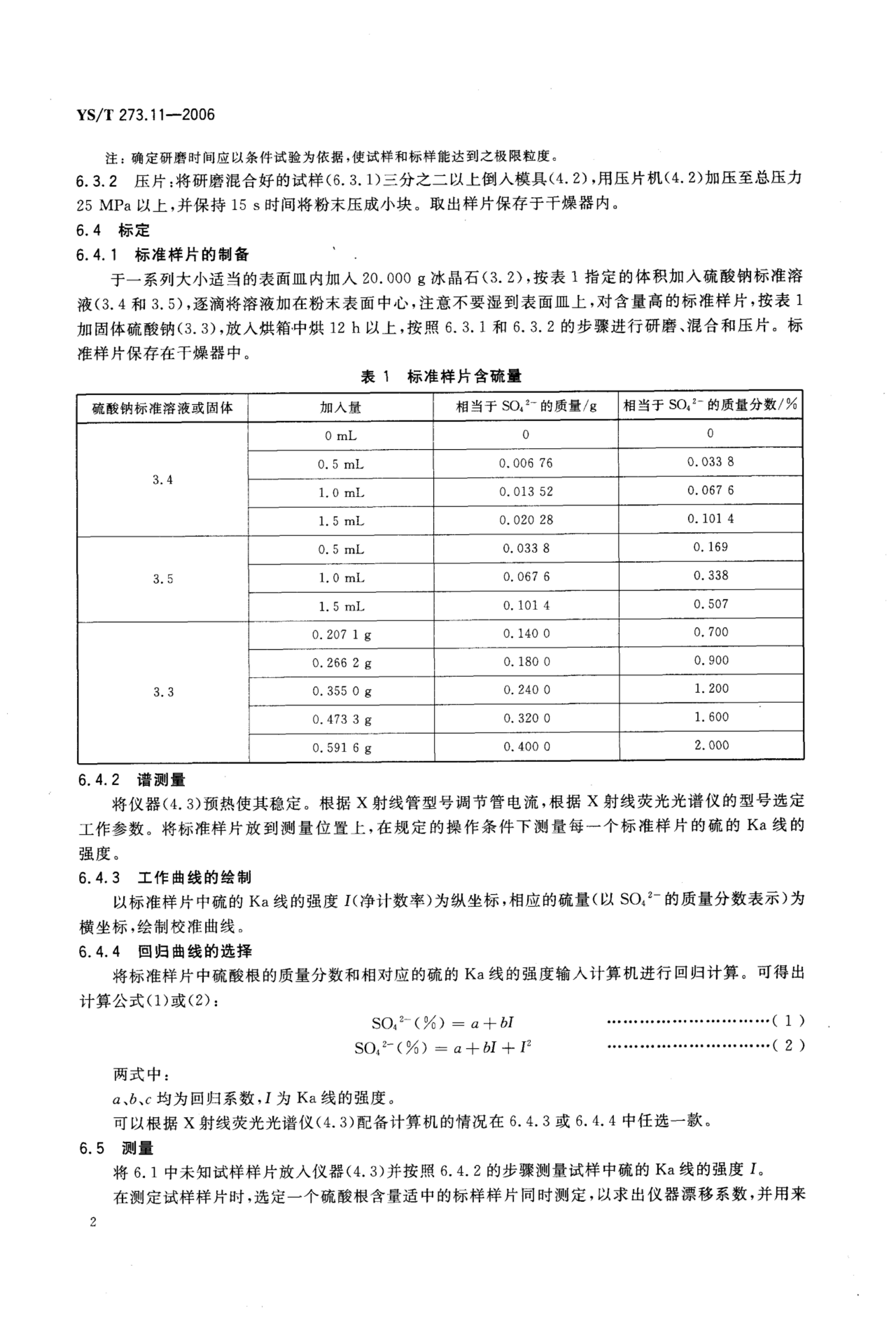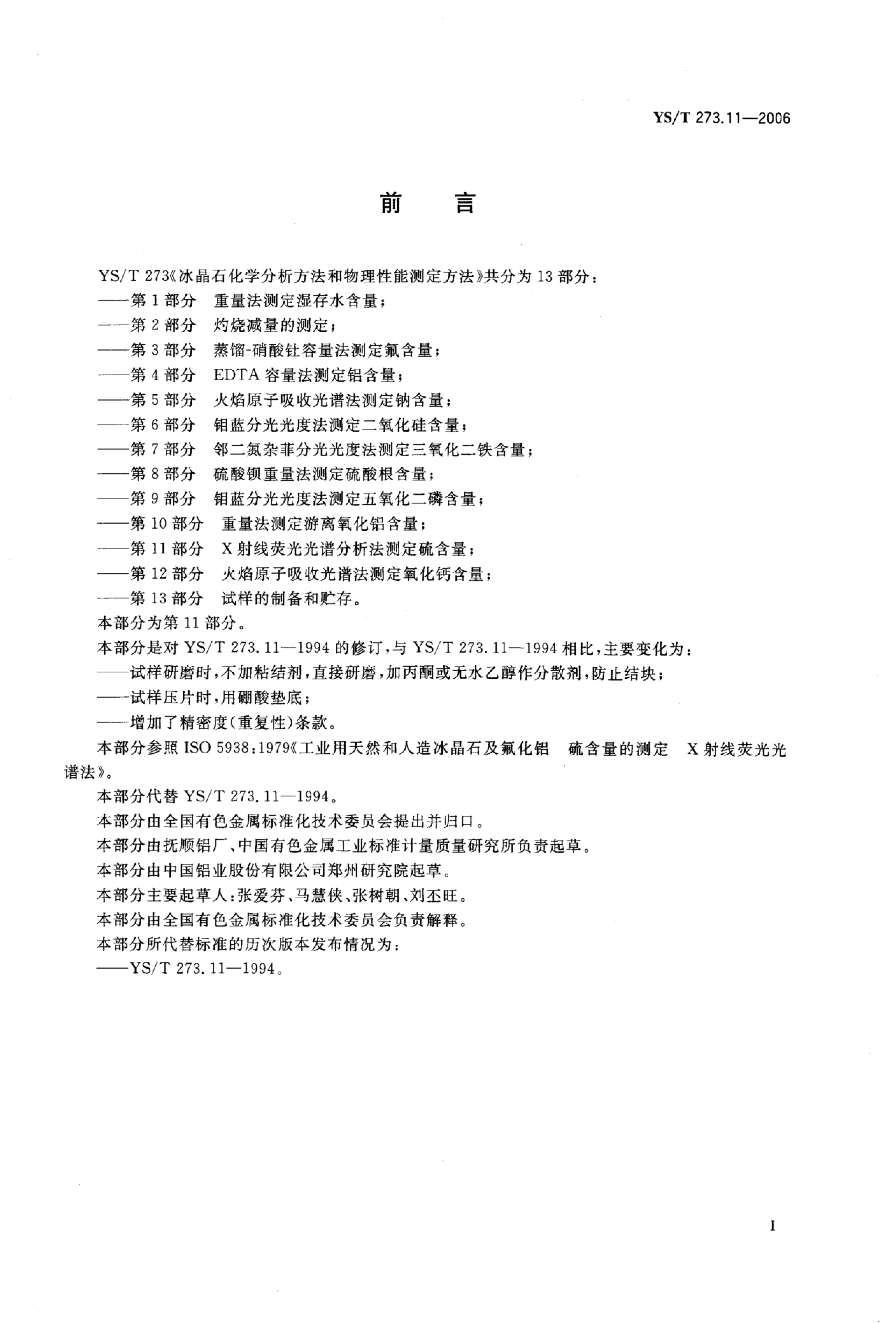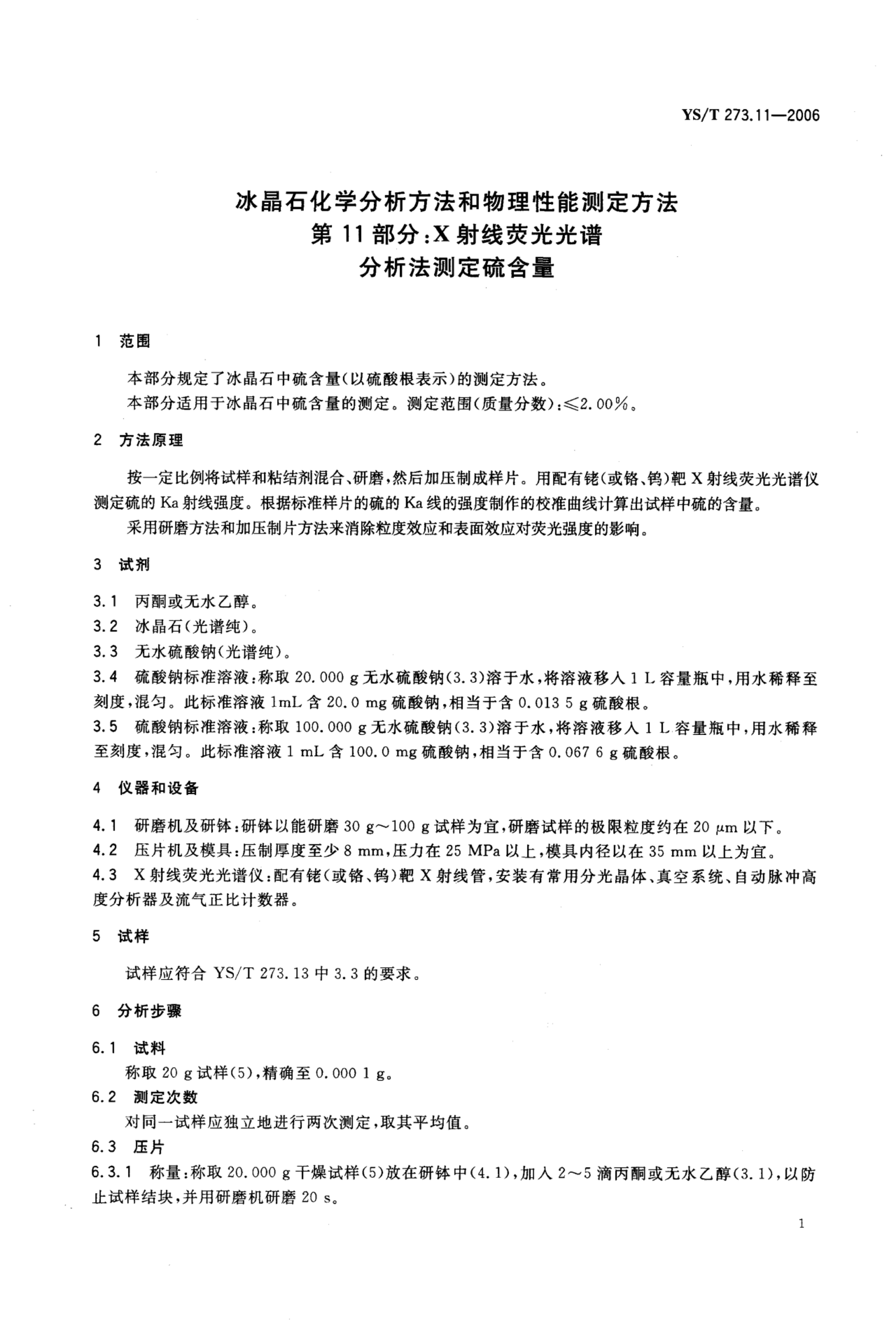 YS/T 273.11-2006 冰晶石化学分析方法和物理性能测定方法 第11部分:X射线荧光光谱分析法测定硫含量