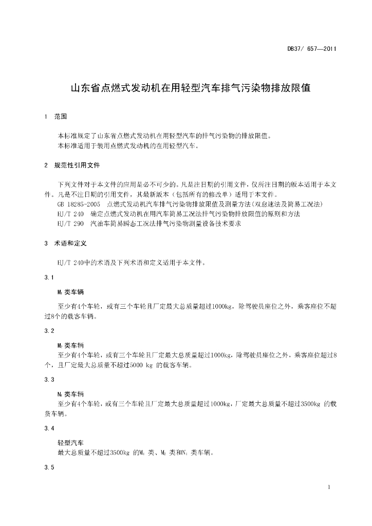 DB37/ 657-2011 山东省点燃式发动机在用轻型汽车排气污染物排放限值