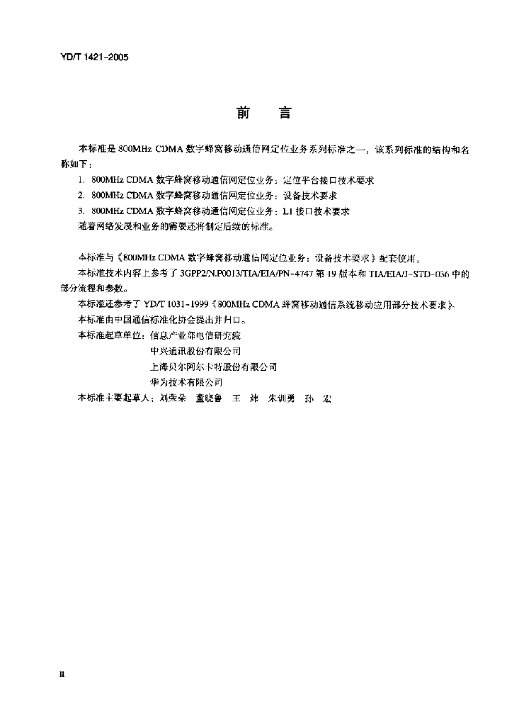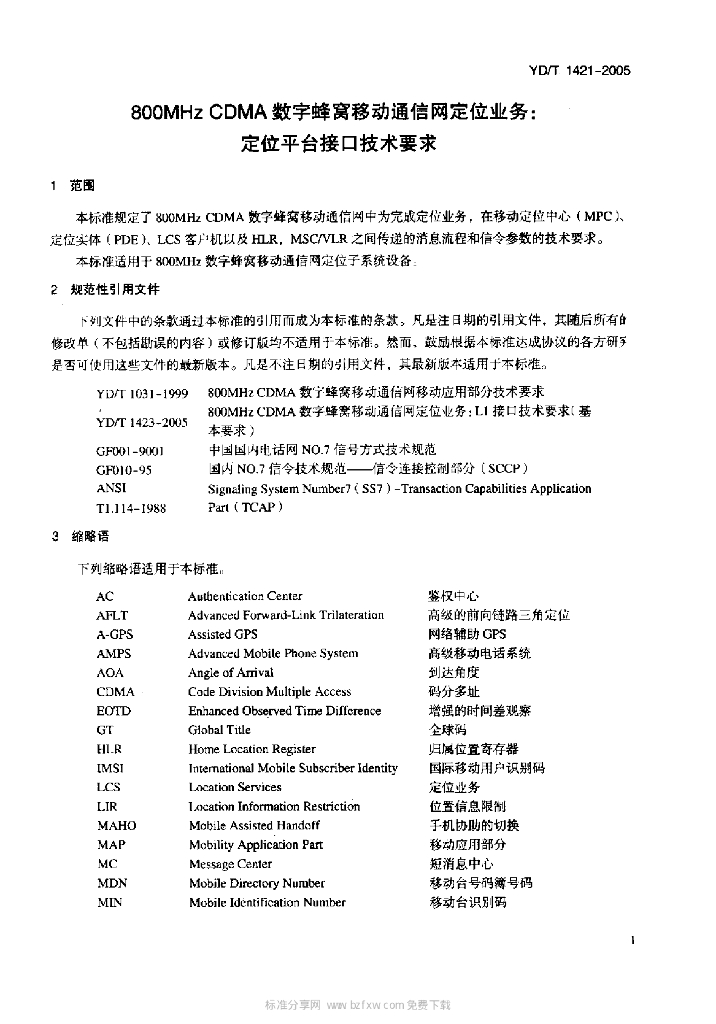 YD/T 1421-2005 800MHz CDMA 数字蜂窝移动通信网定位业务:定位平台接口技术要求