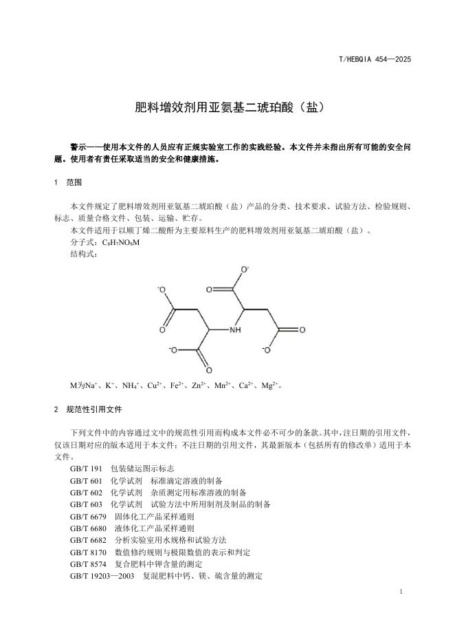 T/HEBQIA 454-2025 肥料增效剂用亚氨基二琥珀酸(盐)