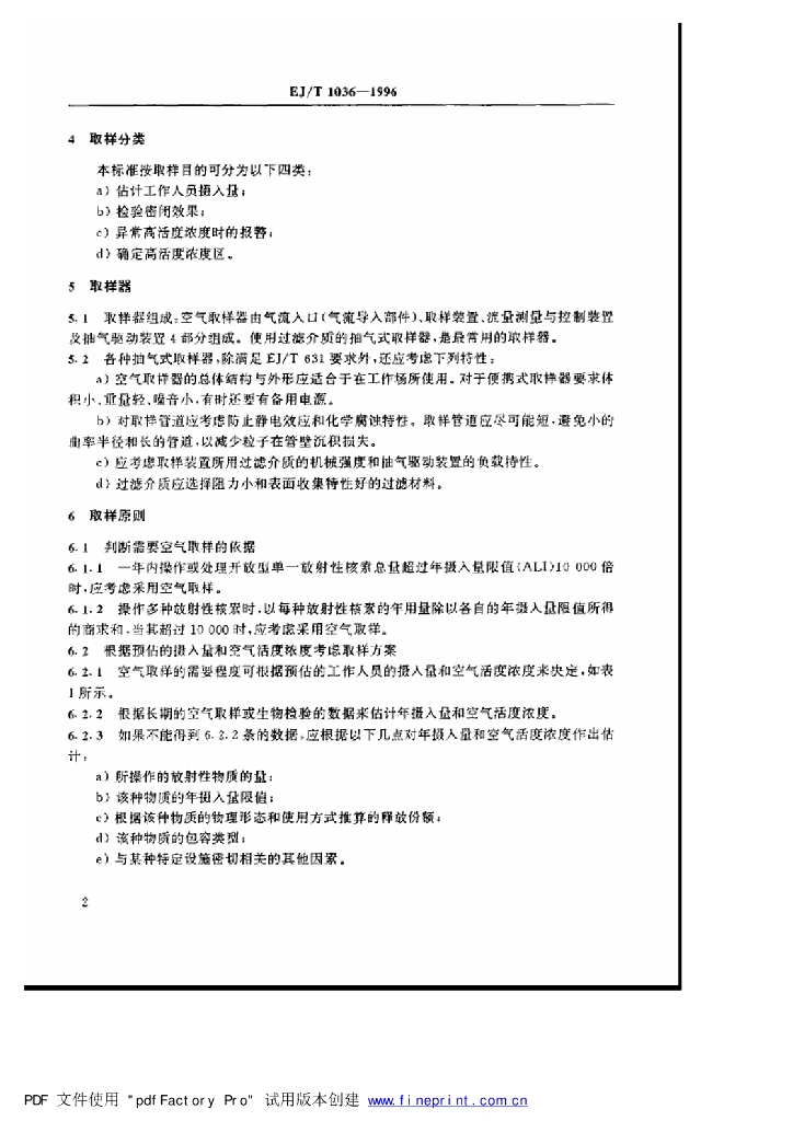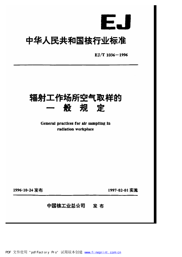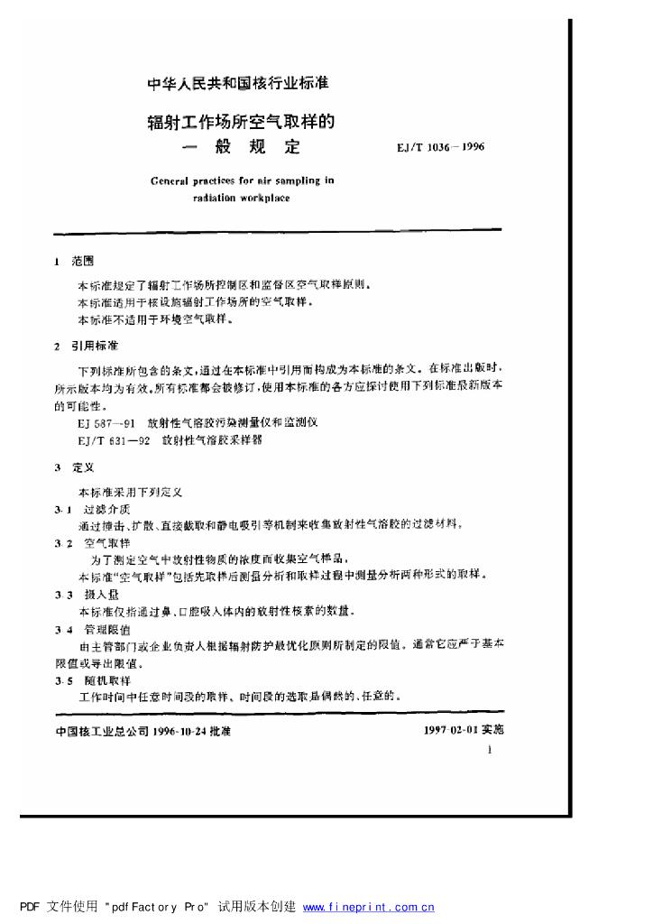 EJ/T 1036-1996 辐射工作场所空气取样的一般规定