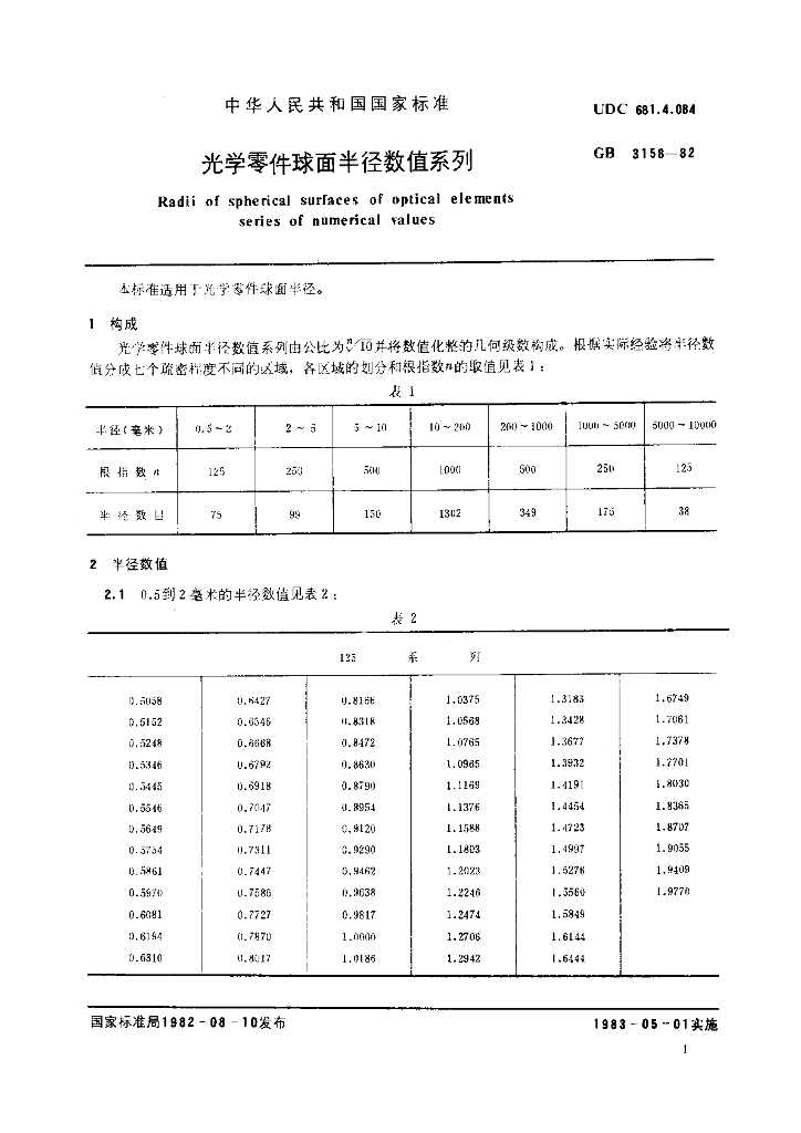 GB/T 3158-1982 光学零件球面半径数值系列