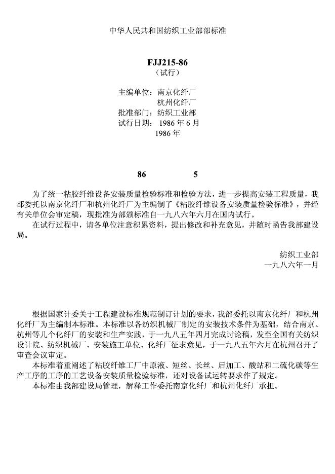 FJJ 215-1985 粘胶纤维设备安装质量检验标准(试行)