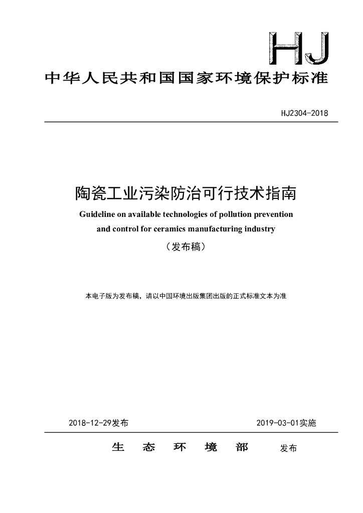 HJ 2304-2018 陶瓷工业污染防治可行技术指南
