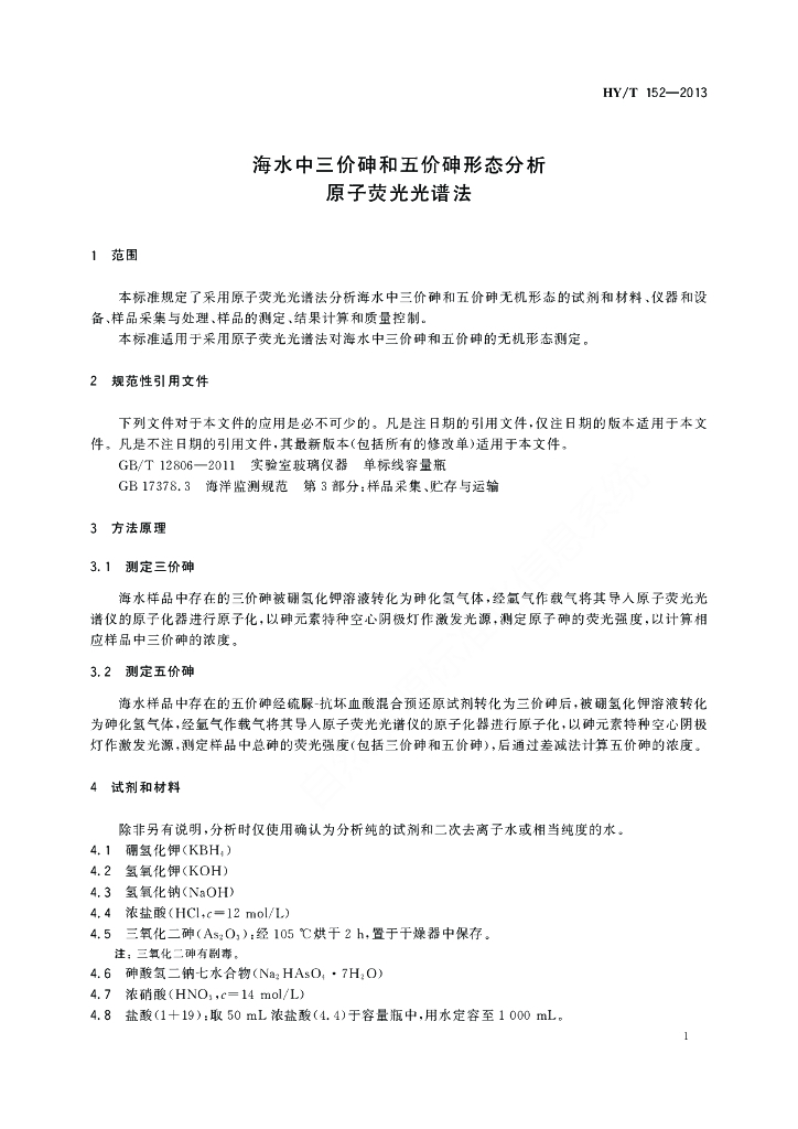 HY/T 152-2013 海水中三价砷和五价砷形态分析 原子荧光光谱法