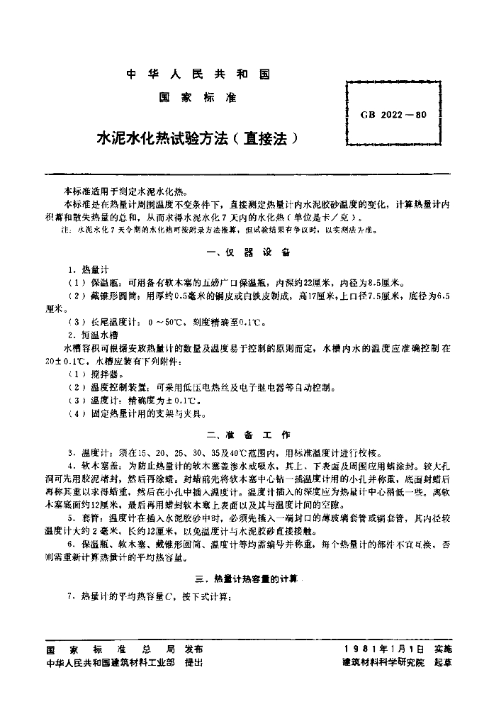GB/T 2022-1980 水泥水化热试验方法(直接法)
