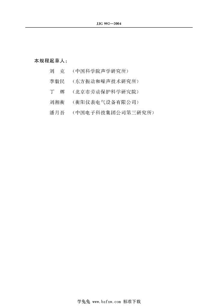 刘克(中国科学院声学研究所)、李毅民(东方振动和噪声技术研究所)、丁辉(北京市劳动保护科学研究院)、刘湘衡(衡阳仪表电气设备有限公司)、潘月吾(中国电子科技集团公司第三研究所)