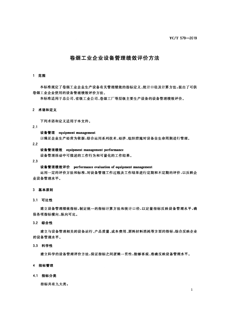 YC/T 579-2019 卷烟工业企业设备管理绩效评价方法