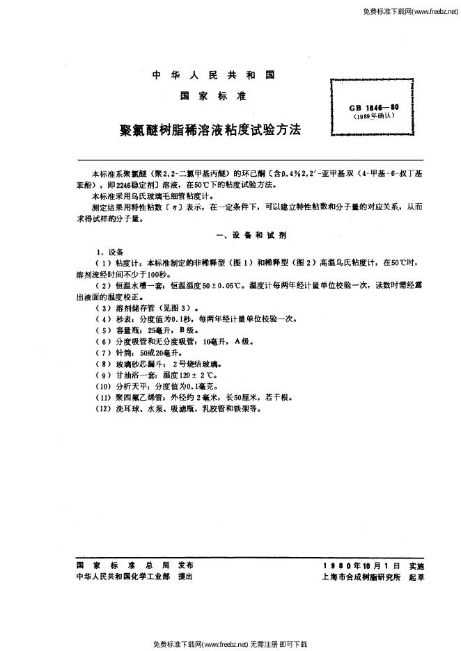 GB/T 1846-1980 聚氯醚树脂稀溶液粘度试验方法