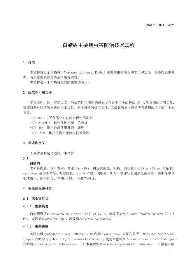 DB41/T 3031-2025 白蜡树主要病虫害防治技术规程