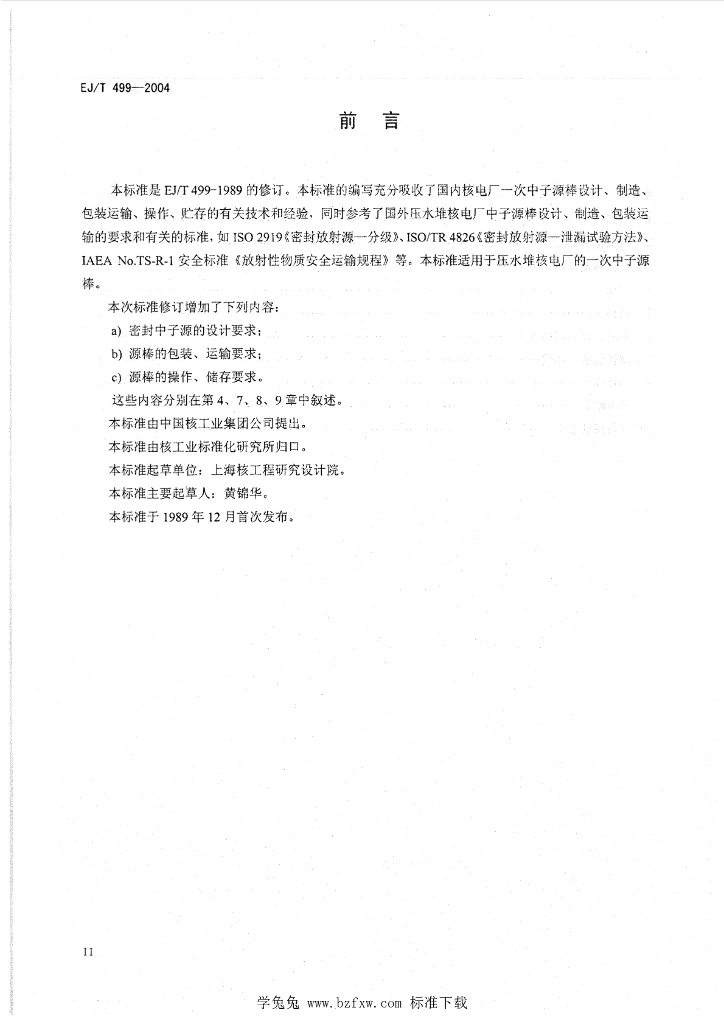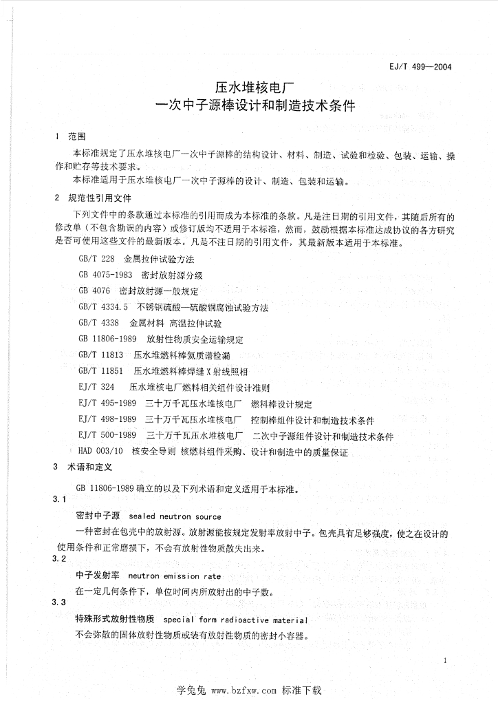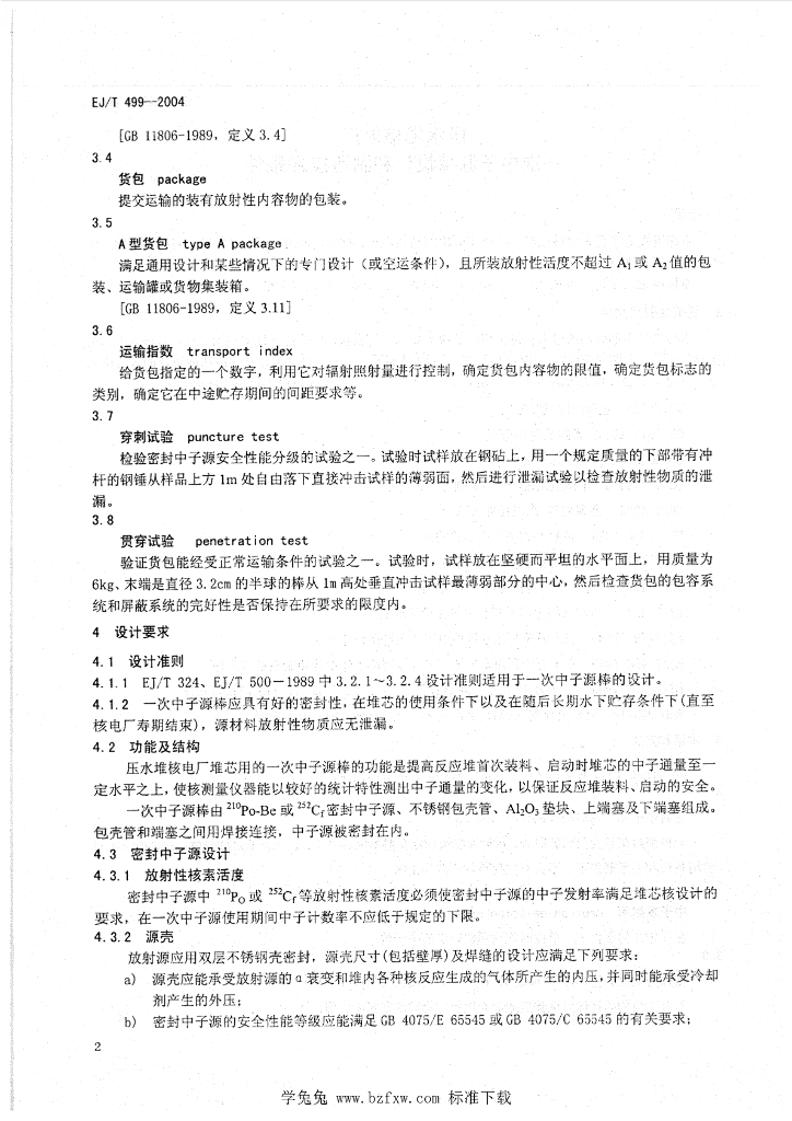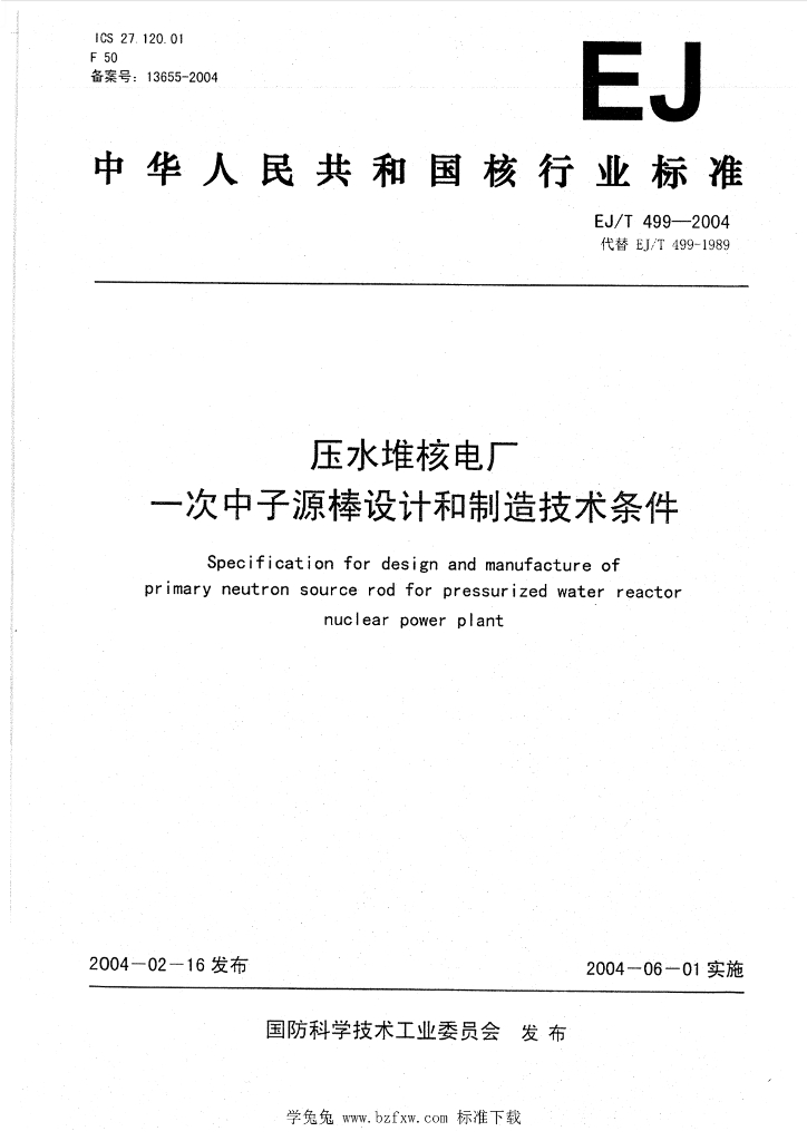EJ/T 499-2004 压水堆核电厂一次中子源棒设计和制造技术条件