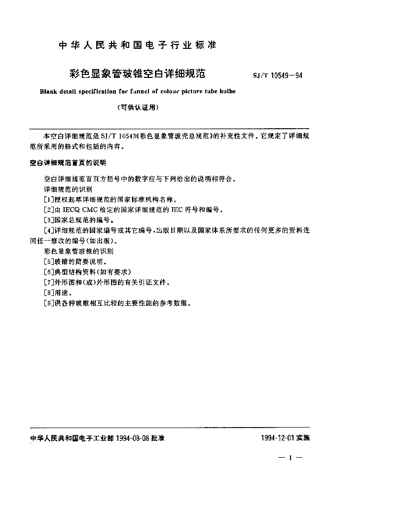 SJ/T 10549-1994 彩色显像管玻锥空白详细规范(可供认证用)