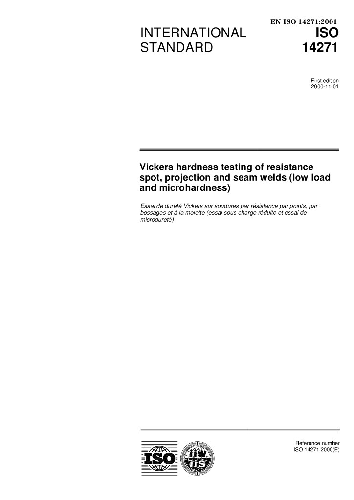 BS EN ISO 14271-2001 Vickers hardness testing of resistance spot, projection and seam welds (low load and microhardness)