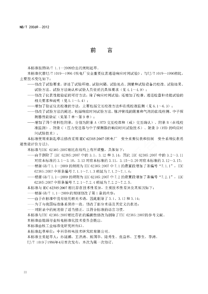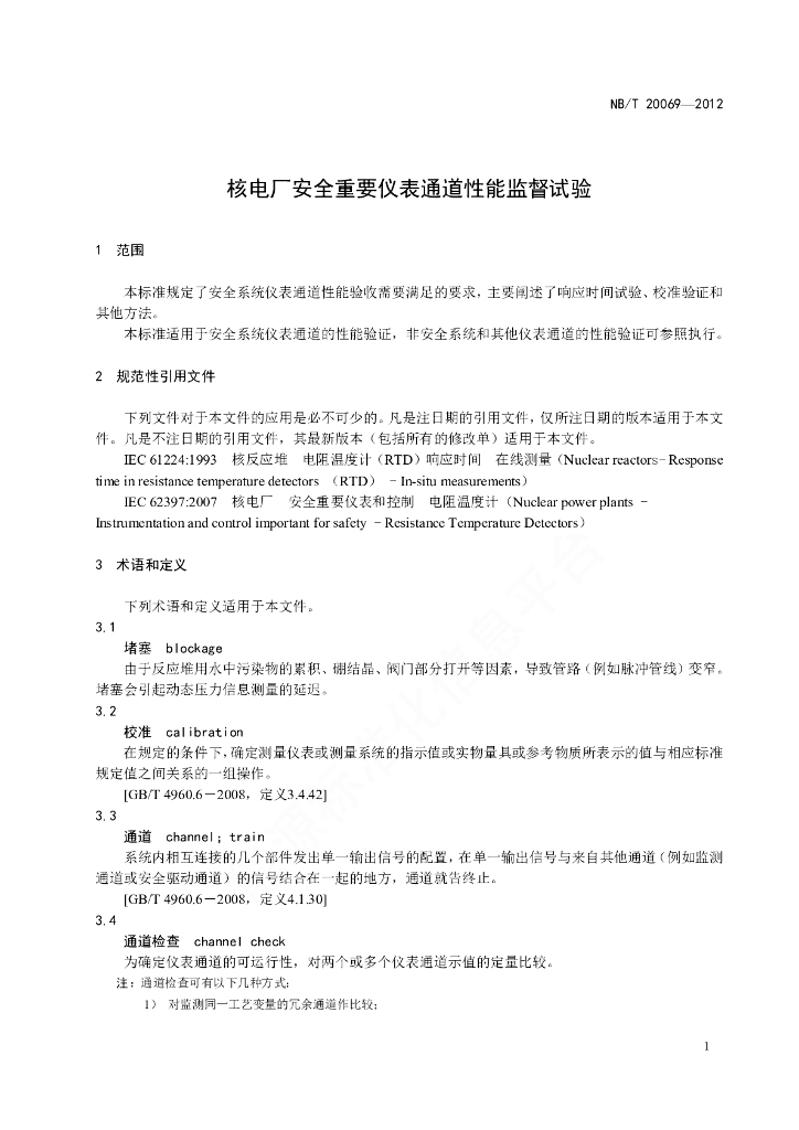 NB/T 20069-2012 核电厂安全重要仪表通道性能监督试验
