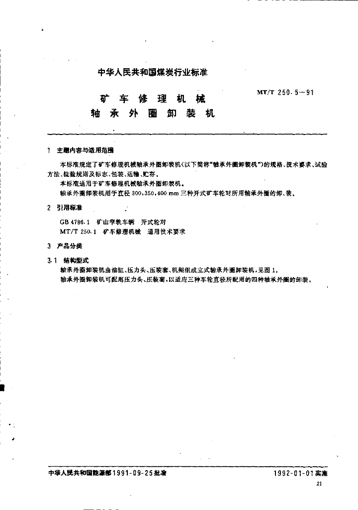MT/T 250.5-1991 矿车修理机械轴承外圈卸装机