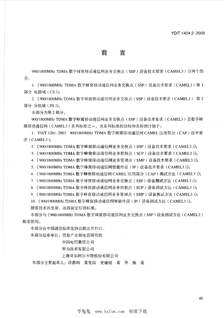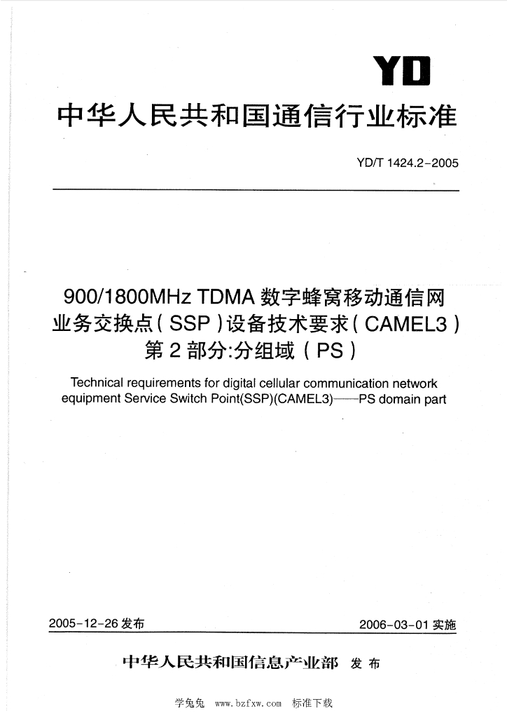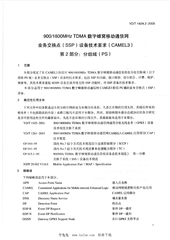 YD/T 1424.2-2005 900/1800MHz TDMA数字蜂窝移动通信网业务交换点(SSP)设备技术要求(CAMEL3) 第2部分:分组域(PS)