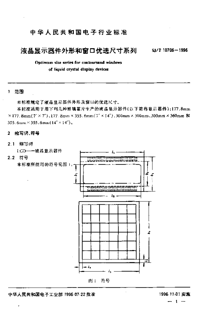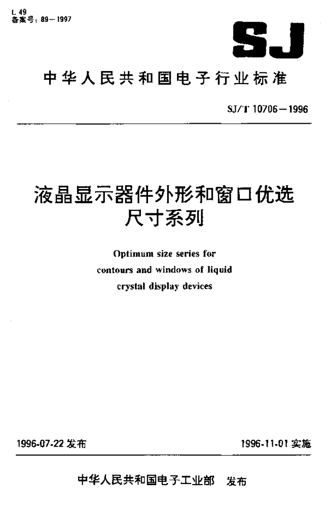 SJ/T 10706-1996 液晶显示器件外形和窗口优选尺寸系列
