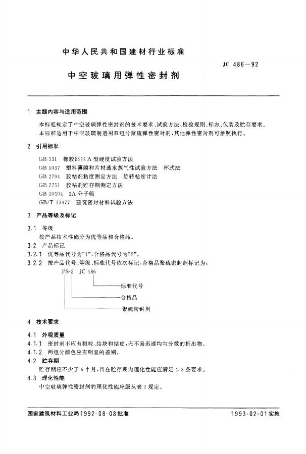 JC 486-1992 中空玻璃用弹性密封剂