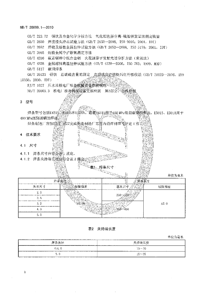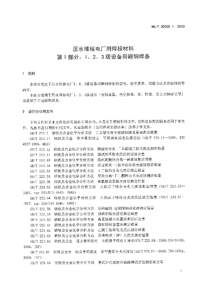 NB/T 20009.1-2010 压水堆核电厂用焊接材料 第1部分:1、2、3级设备用碳钢焊条